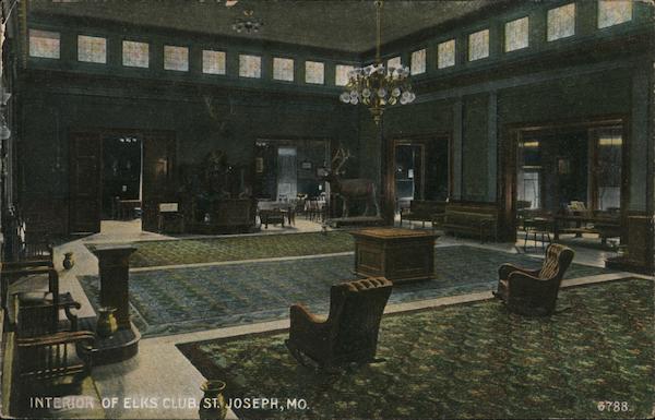 Front: INTERIOR OF ELKS CLUB ST. JOSEPH, Mo. 6788. Back: 3.50 Post Card . One Cent for United States, and Island Possessions, Cuba, Canada and A. C. Bosselman & Co., New York.
