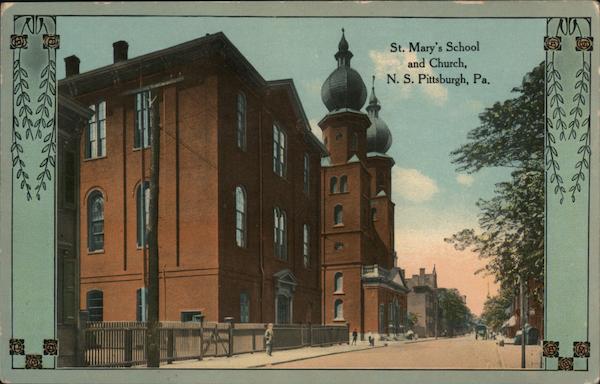 Front: St. Mary's School and Church, N. S. Pittsburgh, Pa, Back: POST CR CARD & SON PITTSBURGH and Island Possessions Cuba, Canada and 5H, PA MESSAGE MAY BE WRITTEN ON THIS SIDE. A-23439