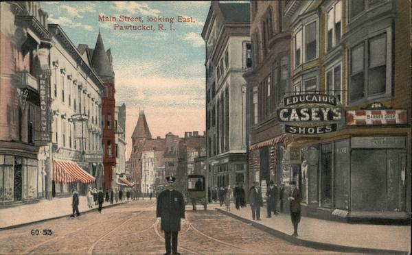 Front: Main Street, looking East, Pawtucket, R. I. EDUCATOR CASEY'S 294 BARNER SHOP SHOES EN AILOB A PICASEY TEA ER STORE 60-53 Back: BRO'S OSPUB UBLISHE P POST BERGER PROVIDE R.L. FOREIGN- BERGER BROS. , PUBLISHERS, PROVIDENCE, R. I.