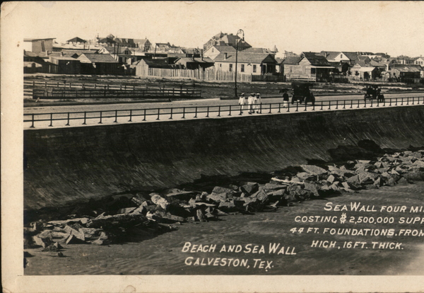 Front: SEAWALL FOUR MILES LONC COSTING 2,500,000 SUPPORTED BY 49 FT. FOUN DATIONS.FROM BASE 17 FT HIGH, 16 FT. THICK. BEACH AND SEA WALL GALVESTON, TEX. Back: Α Α 2 ο 4 Z STAMP 2 NO NO A 2 O V