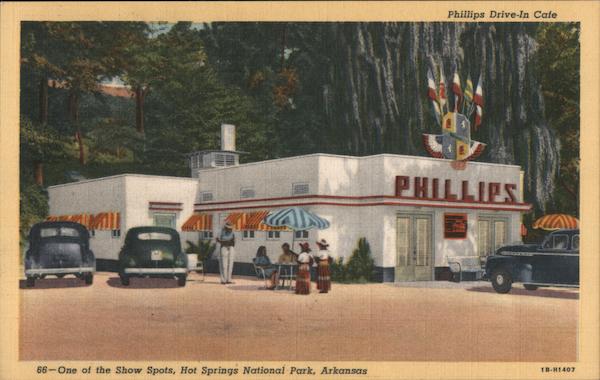 Front: Phillips Drive-In Cafe PHILLIES 66-One of the Show Spots, Hot Springs National Park, Arkansas 1B-H1407 Back: WOODCOCK MFG. CO., HOT SPRINGS NATIONAL PARK, ARK. GENUINE CURTEICH-CHICAGO C.T. ART-COLORTONE' POST CARD (REG.U.S.PAT.OFF.)