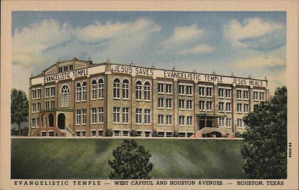 Front: JESUS SAVES EVANCELISTIC TEMPLE EVANCELISTIC TEMPLE JESUS HEALS EVANGELISTIC TEMPLE - WEST CAPITOL AND HOUSTON AVENUES - HOUSTON, TEXAS 3B-H989 Back: GENUINE CURTEICH-CHICAGO "C.T. ART-COLORTONE'' POST CARD (REG.U.S.PAT.OFF.)