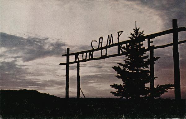 "Camp Gate at Sunset" CAMP KON-O-KWEE Fombell, PA 16123 1 48471 KOLORVUE by Artvue Post Card Co., 160 Fifth Ave., New York, N. Y. 10010