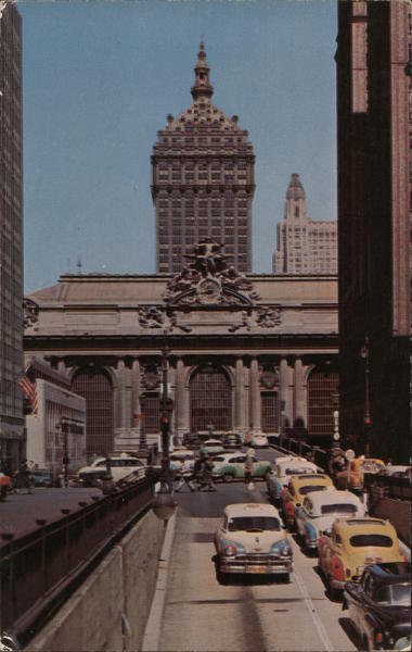 Traffic on ramp in front of Grand Central Terminal, as seen from Park Avenue G 41st Street, New York City. $2.00 Go Alfred Mainzer, 118 E. 28th St., New York 16, N. Y. ALMP 496