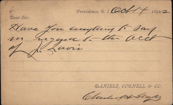 Front: Providence, R. 1.Qo 1t i892.2 Dear Sir: fou mplung le to ay. say -Ue acch of Rani DANIELS, CORNELL & CO. Back: Ver OCTA POSTAL CARD ONE CENT. Slnited States Amorim OS Tahn. ay 18 Nestminder Wunud za