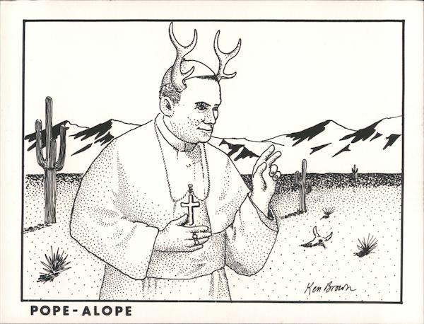 Front: Ken Brown POPE-ALOPE Back: © 1982 ... KEN BROWN CARDS • 65 INMAN ST., CAMBRIDGE, MA.02139 ....