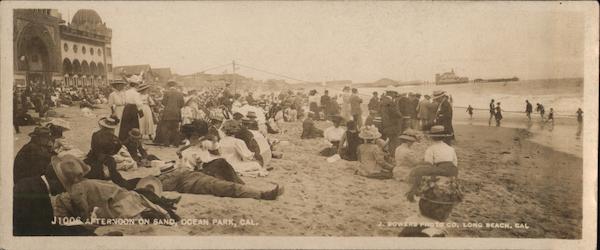 Front: J1006 AFTERNOON ON SAND OCEAN PARK, CAL, 3. BOWERS PHOTO CO, LÒNG BEACH. CAL Back: (See Notes on the Left) Rates of Postage. I this space contains more w it'ng than the name and address of ser der. Letter Rate. J. Bowers Photo Co. Long Beach