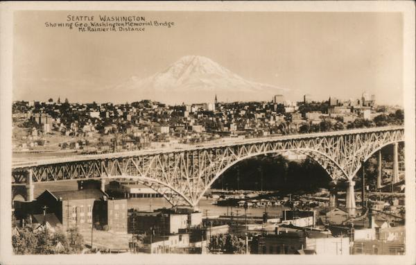 Front: SEATTLE WASHINGTON, Showing Geo,Washington Memorial Bridge Mt.Rainier in Distance WNANNA E C Back: CENIC PHOTO PUBLISHING CO INC ÆATTLE wan Dost ST COROC pondence