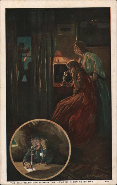 Front: Makerten R-8 THE BELL TELEPHONE GUARDS THE HOME BY NIGHT AS BY DAY Back: OSTEL NVOIA EWE 2. TELEGRAPHCE TOCAL LONG DISTANCE TELEPHONE ASSOCIATED COMPANIES SYSTEM