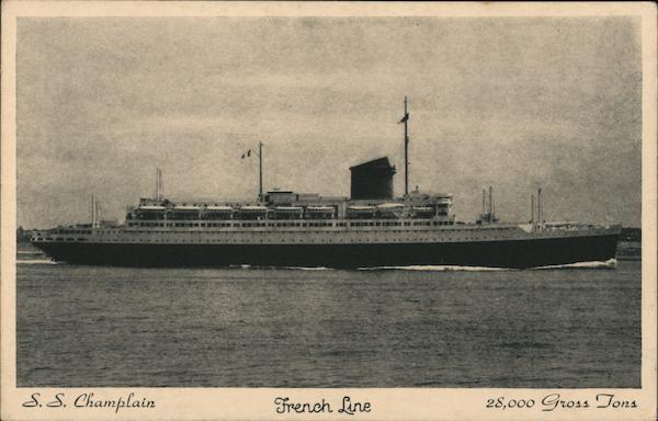Front: S. S. Champlain French Line 28,000 Gross Tons Back: РОРТ САRD “The Longest Gangplank in the World” French Line IN 0.5 А. F. 49c-2-27