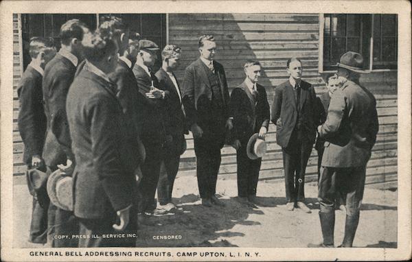 Front: COPY, PRESS ILL. SERVICE INC, CENSORED GENERAL BELL ADDRESSING RECRUITS , CAMP UPTON, L, I. N. Y. Back: 45 Pub. by Eagle Post Card, New York, N. Y.