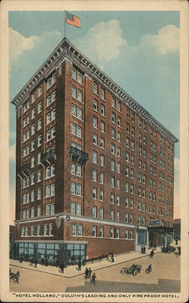 Front: LLLLLLL EEE E GE HEE EF FFEE EE 1 11 1 1 HOLLAND "HOTEL HOLLAND,"DULUTH'S LEADING AND ONLY FIRE PROOF HOTEL. Back: 50 THIS SPACE FODDEN 277151 MADE IN U, S. A. PUBLISHED BY DULUTH PHOTO ENGRAVING CO., DULUTH, MINN. C. T AMERICAN ART Cle go