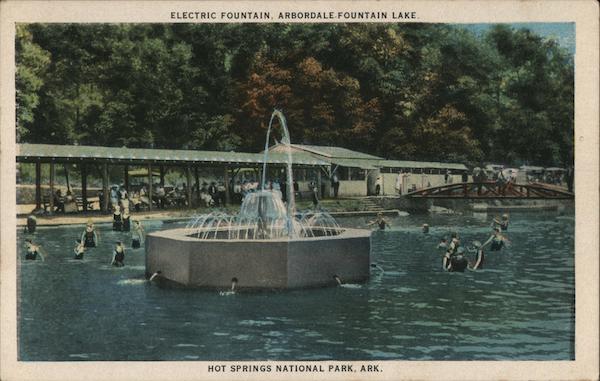 Front: ELECTRIC FOUNTAIN, ARBORDALE-FOUNTAIN LAKE. HOT SPRIN GS NATIONAL PARK, ARK. Back: 94796 25 MADE IN USA AND ISLAND POSSESSIONS, CUBA, CANADA AND MEXICO 251 PUBLISHED BY F. C. BOVING, HOT SPRINGS NATIONAL PARK, ARK. C. T AMERICAN ART CAGE