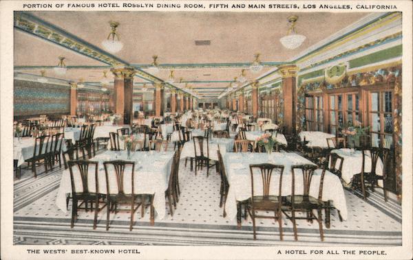 Front: PORTION OF FAM OUS HOTEL ROSSLYN DINING ROOM, FIFTH AND MAIN STREETS, LOS ANGELES, CALIFORNIA THE WESTS' BEST-KNOWN HOTEL A HOTEL FOR ALL THE PEOPLE. Back: 127061 75 FO comes COM PUB. BY B: R. MONTGOMERY, RIVERSIDE, CALIFORNIA. OOKIHHAA