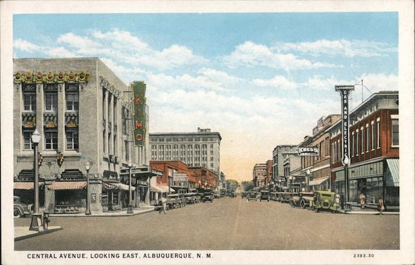 Front: KRESS PHONE CENTRAL AVENUE, LOOKING EAST, ALBUQUERQUE, N. M. 2383.30 CAS AM D ELE CTRIS Back: c. T. AMERICAN ART COLORED CE