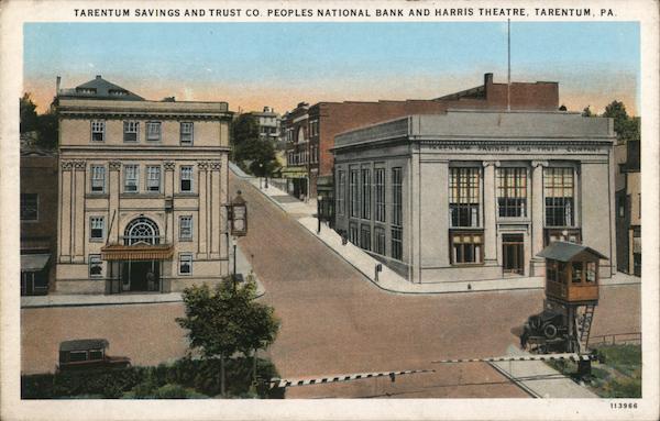 Front: TARENTUM SAVINGS AND TRUST CO. PEOPLES NATIONAL BANK AND HARRIS THEATRE, TARENTUM, PA. VINOS 113966 Back: #3915 49 408 PUBLISHED BY I, ROBBINS & SON, PITTSBURGH, PA. C. T. AMERICAN ART COLORED. QUA RIOR RAS C.