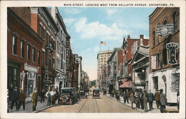Front: MAIN STREET, LOOKING WEST FROM GALLATIN AVENUE, UNIONTOWN, PA. HEADOUARTERS PATT CAFE URIC LADESA dENTs OPEN UZOLTA POOL Back: RA 4.67283 SOCIALIST Party HD QARS PUBLISHED BY 1. ROBBINS & SON, PITTSBURGH, PA. C.T AMERICAN IRAS