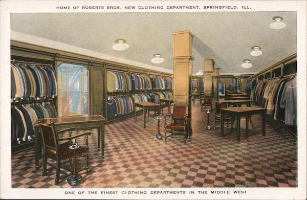 Front: HOME OF ROBERTS BROS. NEW CLOTHING DEPARTMENT, SPRINGFIELD, ILL. ONE OF THE FINEST CLOTHING DEPARTM ENTS IN THE MIDDLE WEST Back: 350 4147N PLACES TO ANYWHERE IN U.S. VIA AIRMAIL MADE IN U.S.A. BY L. C. KROPP CO., MILWAUKEE