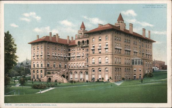 Front: COPYRIGHT, 1905. BY DETROIT PUBLISHING CO. 9618. ANTLERS HOTEL, COLORADO SPRINGS, COLO. Back: AND CANADA. FOREIGN. TWO MADK ONLY BY DETROIT PUBLISHING CO. "PHOSTINT” CARD. THIS SPACE MAY BE USED FOR MESSAGE.