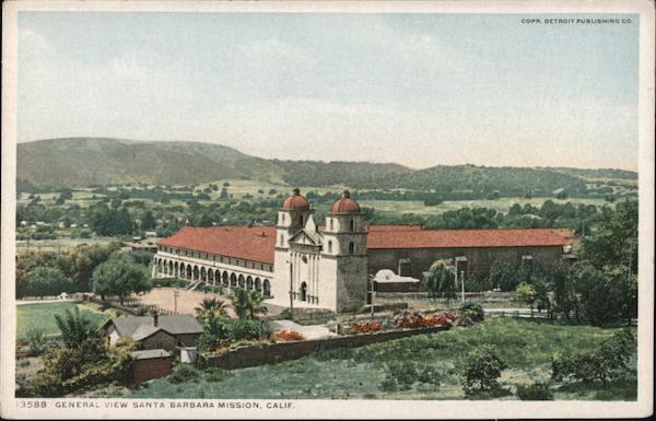 Front: COPR. DETROIT PUBLISHING CO. 13588 GENERAL VIEW SANTA BARBARA MISSION, CALIF. Back: AND CANADA, FOREIGN. TWO MADE ONLY BY DETROIT PUBLISHING CO. "PHOSTINT” CARD. TRADE MARK - REG. V. S. PAT. OFF. THIS SPACE MAY BE USED FOR MESSAGE.