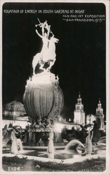 Front: FOUNTAIN OF ENERGY IN SOUTH GARDENS AT NIGAT PAN:PAC,INT. EXPOSITION esSAN FRANCISCO,1915 CARDINEL SAN OFFICIAL F E106 Back: A A ZO A NO NO Α Α 2 ο Α