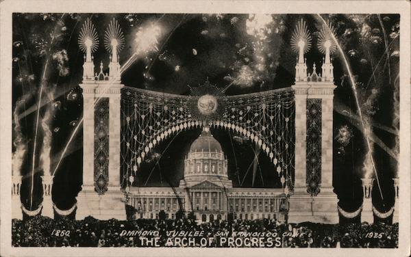 Front: 1925 DIAMOND, UVBILEE A THE ARCH.OF PROGRESS /85Q SAN ERAN01SCO CANE Back: 81 NO NO This is the city hall and it was all lights and they had fire works the whole city. But it looped better thame the picture shows was like this