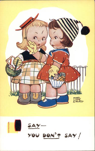 Front: 741 MABEL LUCIE A FWEL SAY- YOU DON’T SAY ! Back: In C ALL GENUINE ATTWELL POSTCARDS MABEL HAVE THE ARTIST'S SIGNATURE THUS: • LUCIE ATTWELL COPYRIGHT. VALENTINE & SONS, LTD., DUNDEE AND LONDON. 5651 Valentine's GT. BRITAIN