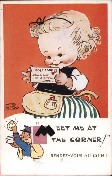 Front: MABEL ECIE EET ME AT THE CORNER/ RENDEZ-VOUS AU COIN ! Back: ALL GENUINE ATTWELL POSTCARDS MABEL HAVE THE ARTIST'S SIGNATURE THUS: - LUCIE ATTWELL COPYRIGHT VALENTINE & SONS, LTD., DUNDEE AND LONDON 5492 Valentine's GT BRITAIN