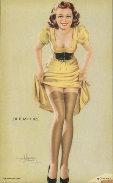 "Jutht my thize" - A woman holds her dress up to show off her thigh high stockings