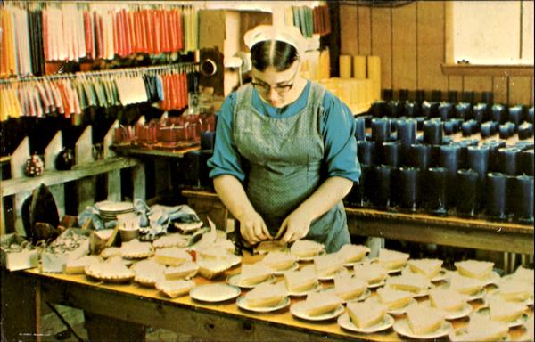 | An Amish girl at work making candles at the Old Candle Barn, Leola, Penna. Operated by Amish, the Old Candle Barn is open to the public, see the candles being made and take along some of the fine work. Specialty candles and regular candles are produced in a variety of scents. |