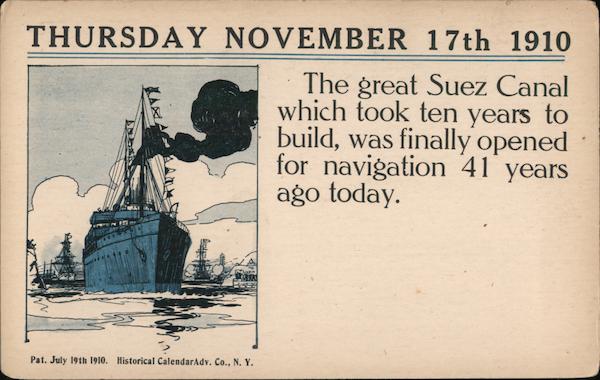 THURSDAY NOVEMBER 17th 1910 The great Suez Canal which took ten years to build, was finally opened for navigation 41 years ago today. Pat. July 19th 1910. Historical CalendarAdv. Co., N. Y. Aud KA A