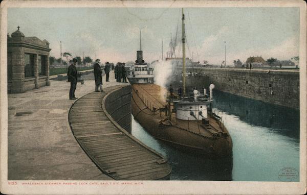 Front: COPYAIGHT 1905 BY DETROT PHOTOGRAPHIC CO. 9125. WHALEBACK STEAMER PASSING LOCK GATE, SAULT STE. MARIE, MICH. Back: AND CANADA, FOREIGN. TWO MADE ONLY BY DETROIT PUBLISHING CO. "PHOSTINT"CARD. 50 THIS SPACE MAY BE USED FOR MESSAGE.
