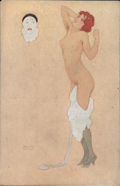 Nude Woman, Pierrot Raphael Kirchner Pierrot With A Nude Woman Raphael Kirchner Series 7 A mime is invisible and a woman undresses and seems to be yawning and getting ready for bed. La Luxure [The Lust] - Woman wearing a fur wrap with dress around ankles, Pierrot Raphael Kirchner Semi nude woman pounding astonished Pierrot head with shoe Raphael Kirchner From the Darlene Thorne Collection |