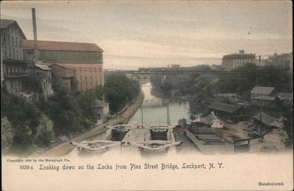 Front: Copyright 1905 by the Rotograph Co. 5629 a. Looking down on the Locks from Pine Street Bridge, Lockport, N. Y. Handcolored, Back: Piace One sent Two sents The Rotograph Co., N. Y. City. (Germany.;
