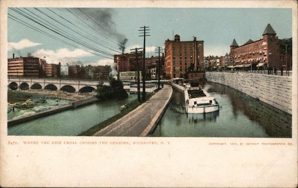 Front: 8471. WHERE THE ERIE CANAL CROSSES THE GENESEE, ROCHESTER, N. Y. COPYRIGHT, 1904, BY DETROIT PHOTOGRAPHIC CO. Back: AND CANADA, FOREIGN, Two Cents.