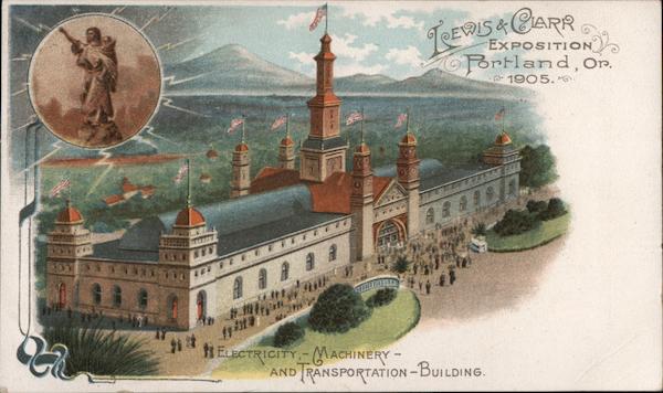 Front: Teews DEWIS & CARA EXPOSITION) Portland, Or. 1905.. 412) 20 A A A 11 ELECTRICITY,- MACHINERY AND TRANSPORTATION-BUILDING. Back: 4- POST CARD - CARTE POSTALE SIDE