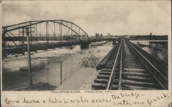 Front: MORRIS BROS.. TUOLUMNE RIVER, MODESTO, CAL. Corne dere & take a walks across arith me the bridge - Jessie Back: UNITED STATES OF ME JUNS JU 7 AM 1706 FRANKLIN 1790 ONIE CENA 1906 Miss Dorothy Tennis 12500 St Charles, alumida Cal.
