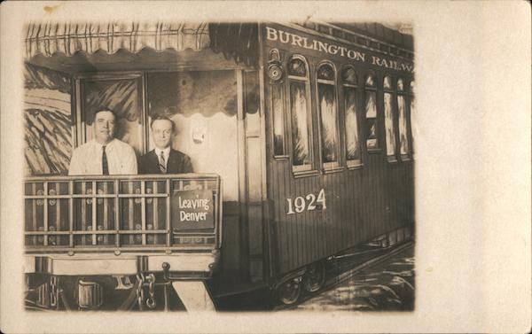 Front: BURLINGTON RAILW का Leaving Denver 1924 Back: Chetty to cool A A A << NO NO If you want more of these post cards write or call, ELECTRIC STUDIO No. 2, 1406–17th ST., DENVER, COLO. A 2 O