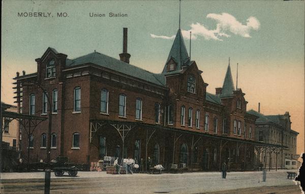 Front: MOBERLY, MO. Union Station GALD Back: TATE CK 1306 FRANKLIN 1790 COMMUNICATIONS سه فيه I wish could be with Miss Birdie Meier me. Carrollton 8372 Pub, by Robinson & Baker, Moberly, Mo. Norma. Mo. you