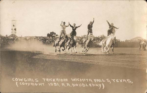 Front: COWGIRLS TRICK RIDIN WICHITA FALL S, TEXAS, (COPY RIGHT 1921, R.R, poUBLEPAY Back: A A z o A Z STAMP 2 NO A 2 O