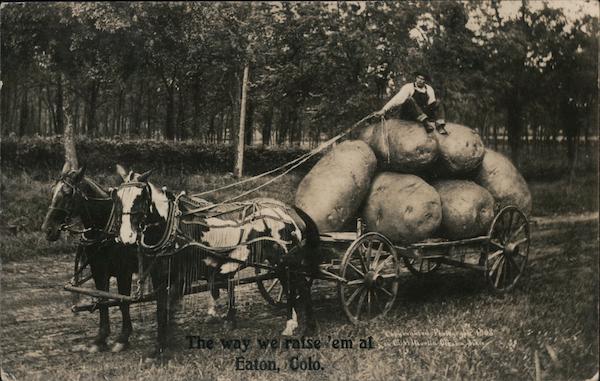 Front: 1908 alhrila Qlia-s The way we raise 'em at Eaton, Colo. Back: TRT 1,322 pop 1940 U.S POSTA APA 28 820PM 1909 ONE PRAYER Fabio ADDRESS HERE And we raise Still Bigger spudo on the Miss Magde Ward Lucerne Colo hill ERS.