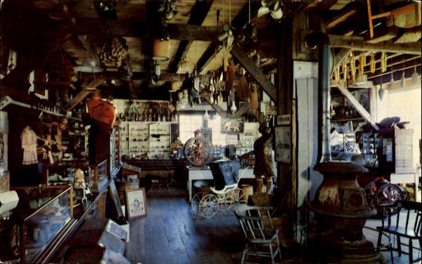Country Store interior at Old Museum Village of Smith's Clove, Monroe, N. Y. Routes17, 6 and 208. Display of goods on counters, shelves, walls, and hanging from the ceiling, follows the pattern of the 19th century. One of 25 buildings in this "old crossroad" village, dedicated to the preservation of Americana. |