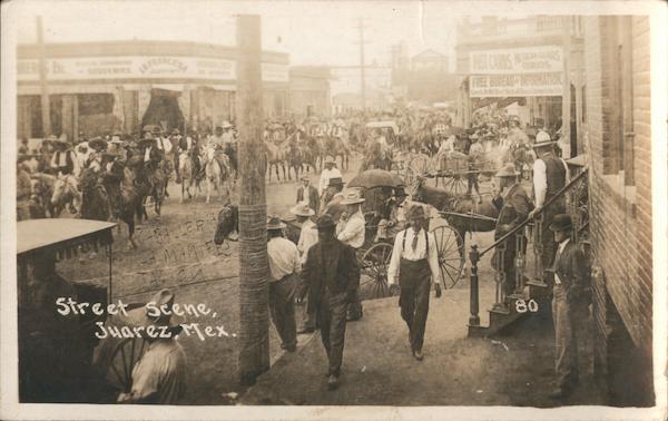 Front: SOUVERIRS ES ARINGESA NST CARDS EXCAN CIGARS CURIOS FREE BUREAU INFORMATION Cinel e il CURN CHEALLERI MARE Street scene, Juarez, Mex. 80 Back: A ZA (NO Az o А у