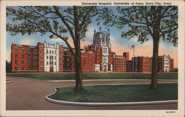 Front: University Hospital. University of Iowa, Iowa City, Iowa ERT LLLLL 4A-H612 Back: IOWA CITY NEWS AGENCY, IOWA CITY, TOWA GENUINE CURTEICH-CHICAGO “C.T. ART-COLORTONE' POST CARD (REG.U.S.PAT.OFF.)