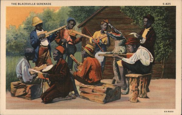 Front: THE BLACKVILLE SERENADE S-425 6 A-H455 Back: Registered “C.T.ART-COLORTONE” REG.U.S. PAT.OFF. MADE ONLY BY CURT TEICH & Co., INC., CHICAGO C. T. SOUTHERN PICKANINNY SCENES,