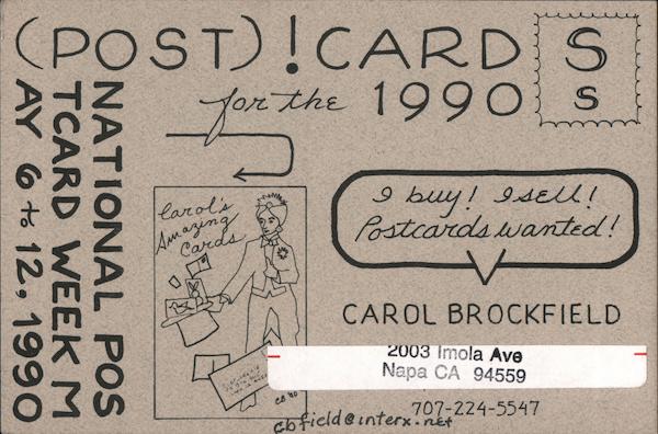 (POST)!CARD S for the 1990 s larol's Ammazing Cards I buy! Isell! Postcardswanted! CAROL BROCKFIELD 2003 Imola Ave Napa CA 94559 oruCktiald CB 40 abfieldeinterx.net 707-224-5547 ONATIONAL POS 1 TCARD WEEK M AY 6 to 12, 1990