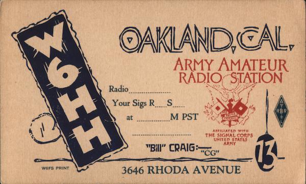 OAKLAND.CAL, ARMY AMATEUR RĂDIO STATION Radio Your Sigs R S RER M PST PRO LATRIA VICILANS at AFFILIATED WITH THE SIGNAL CORPS ARMY "Bill" CRAIG“CG" 3646 RHODA AVENUE W6FS PRINT AAee