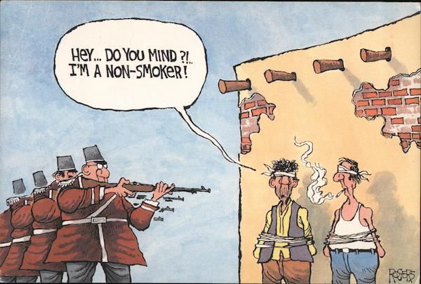 Front: H... DO YOU MIND ?!. I'M A NON-SMOKER? Back: Style No. 10368 © 1988 Rob Rogers Then RADICALLY ROGERS. The Maine Line Co., Rockland, Me. 04841 ©1989 Rob Rogers • Lic. by UFS, Inc. TM