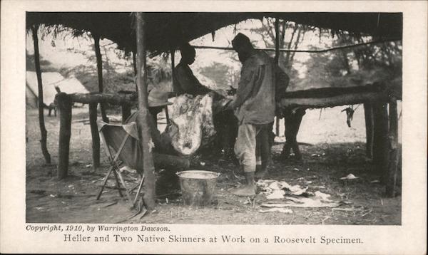 Heller and Two Native Skinners at Work on a Roosevelt Specimen.
