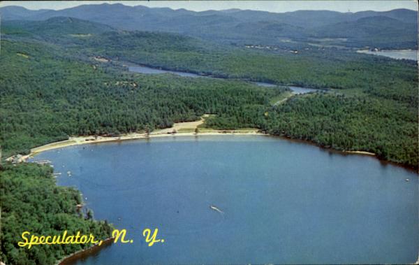 An aerial view of the largest, and one of the most beautiful recreation areas in the Adirondacks, Moffitts Beach on Sacandaga Lake. Echo Lake, as well as Lake Pleasant, can be seen in the background.